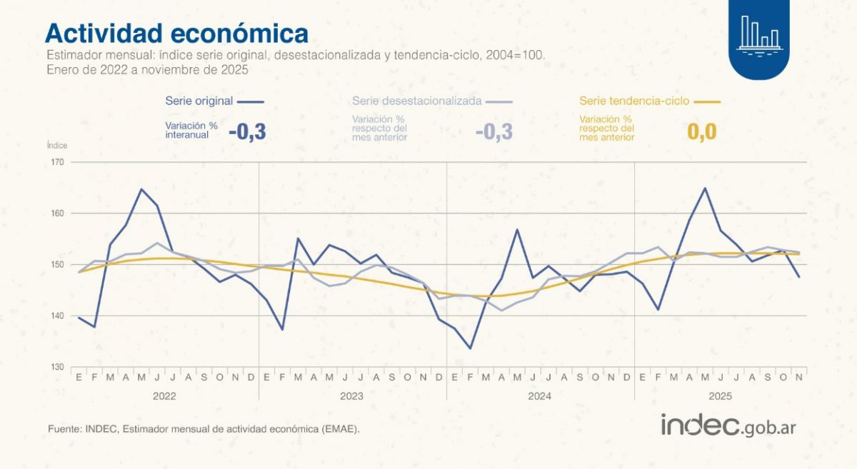La actividad económica disminuyó 0,3% interanual en noviembre de 2025 y 0,3% con respecto a octubre https://t.co/hqPN3y0Nvl pic.twitter.com/Oz6ITl4FlP